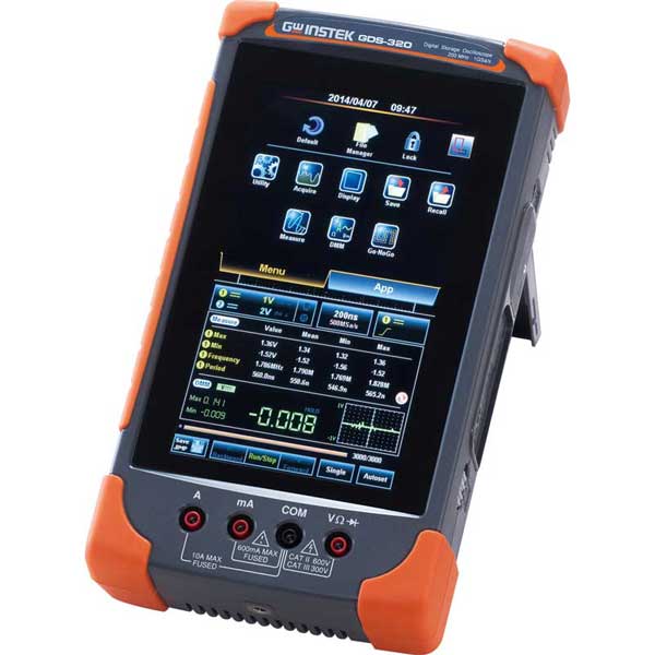 GDS-300/GDS-200系列智能示波器可以直立或橫向觀看使用。在不同的量測(cè)環(huán)境下,工程師往往對(duì)示波器的訴求也會(huì)不同。當(dāng)需要外出量測(cè)的時(shí)候,由于環(huán)境的限制以及強(qiáng)調(diào)功能合一的整合性,所以常常需要以直立式的方式來進(jìn)行量測(cè),這不僅可以進(jìn)行示波器波形的量測(cè),亦可結(jié)合數(shù)位多功能電表進(jìn)行整合性的觀測(cè)。當(dāng)量測(cè)環(huán)境處于室內(nèi)的狀況下,工程師常常以穩(wěn)定量測(cè)以及大畫面為訴求,所以需要進(jìn)行橫向量測(cè)使用,這不僅能夠提供7寸全屏幕的量測(cè)畫面,亦能當(dāng)作桌上型的示波器穩(wěn)定使用。