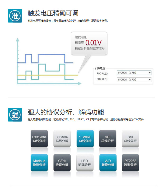 | 協議分析 | 計算機外設CF卡協議分析 IC接口8051外部總線分析 A/D轉換分析通用CLK總線分析 IIC總線1-WIRE總線IIC/SMBus總線SPI總線SSI總線UART(RS-232C/422/485) 存儲器SD卡SPI模式協議分析I²CSPI 光電7段數碼管LCD12864總線分析LCD1602總線分析LED矩陣分析 紅外線NEC紅外傳輸協議分析PT2262波形分析Philips RC-5 Philips RC-6 無線通訊雙相曼徹斯特編碼分析變形彌勒編碼分析 Wiegand 其他Modbus協議分析PCF8591分析DS1302分析別名表 | 計算機外設CF卡協議分析 IC接口8051外部總線分析 A/D轉換分析通用CLK總線分析 IIC總線1-WIRE總線IIC/SMBus總線SPI總線SSI總線UART(RS-232C/422/485) 存儲器SD卡SPI模式協議分析I²CSPI 光電7段數碼管LCD12864總線分析LCD1602總線分析LED矩陣分析 紅外線NEC紅外傳輸協議分析PT2262波形分析Philips RC-5 Philips RC-6 無線通訊雙相曼徹斯特編碼分析變形彌勒編碼分析 Wiegand 其他Modbus協議分析PCF8591分析DS1302分析別名表 |