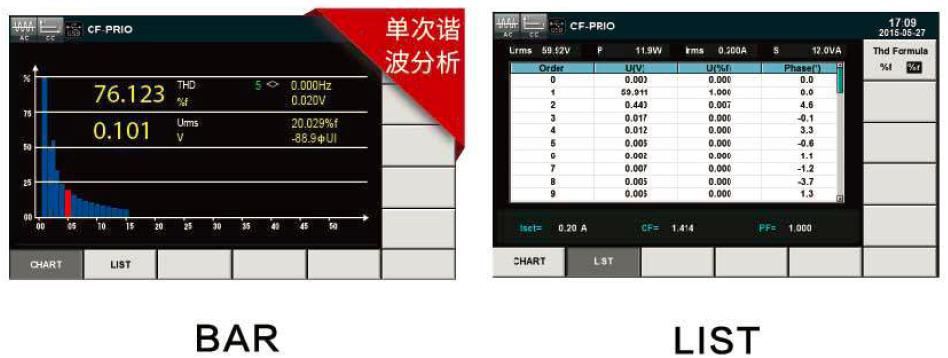 IT8600提供了功能強大的數(shù)據(jù)量測功能,除了可以測量常規(guī)的Vrms、Vpk、Vdc、Irms、Ipk、Idc、W、VA、VAR、CF、PF、Freq等參數(shù)外,更提供獨特的電壓諧波分析功能,以驗證待測物(不間斷電源UPS,發(fā)電機等)。對于電網(wǎng)的諧波干擾,具有高達50次電壓諧波的分析功能,并且可以以不同形式顯示各次諧波所占百分比的分析結(jié)果。